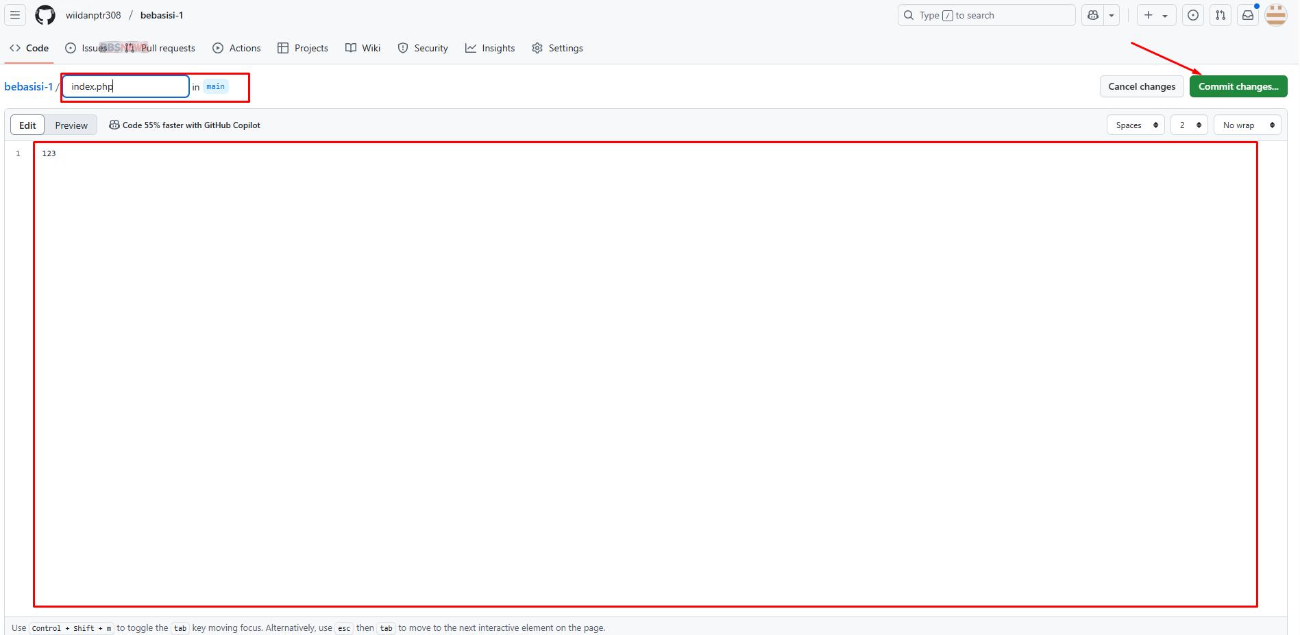 kalian wajib mengisi bernama file nya ” index.php ” dan codenya bebas mau masukin script apa, gunanya berfungsi untuk menaroh di script landingpagee saat deploy, dan kalian “commit changes” buat save.